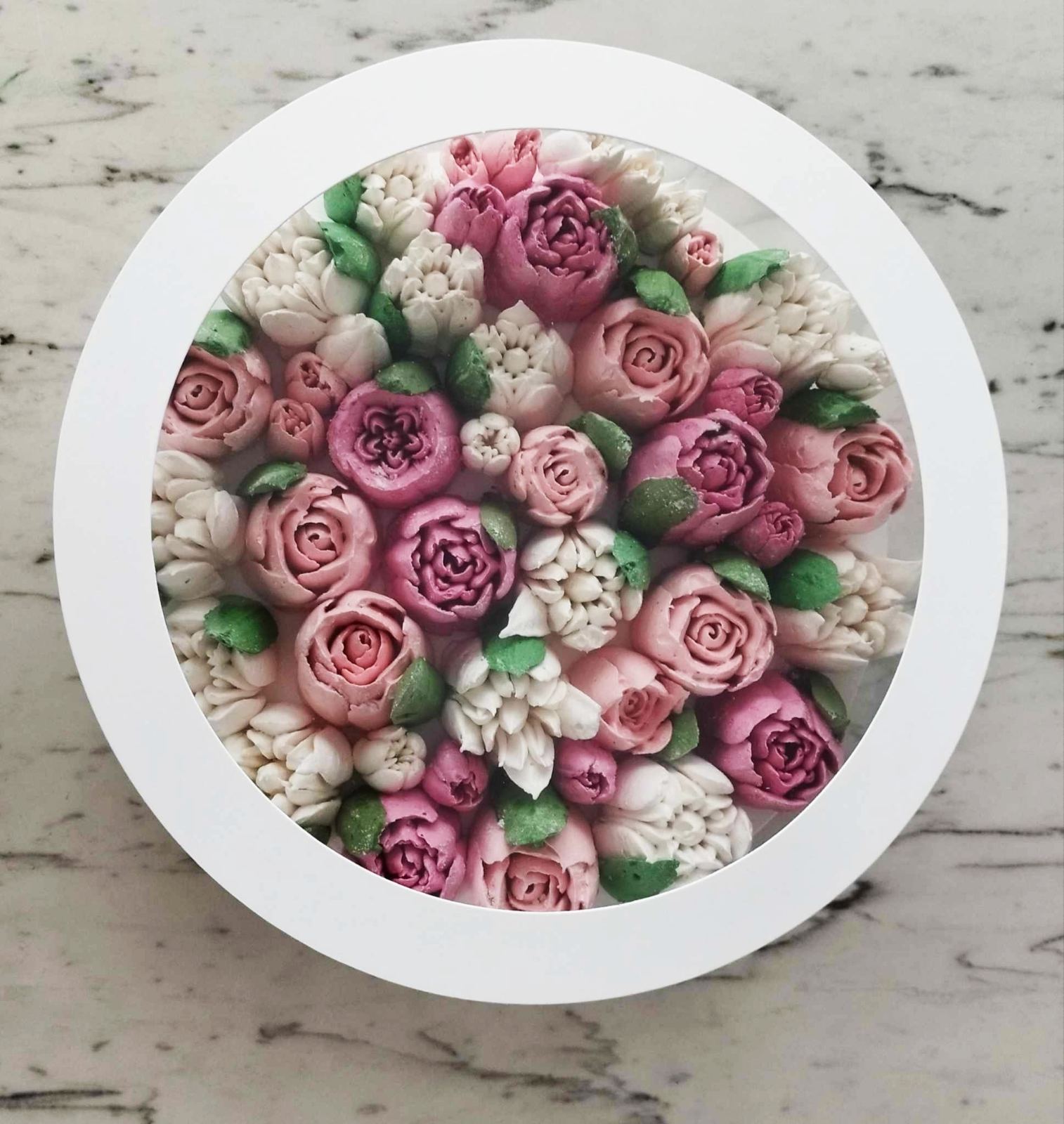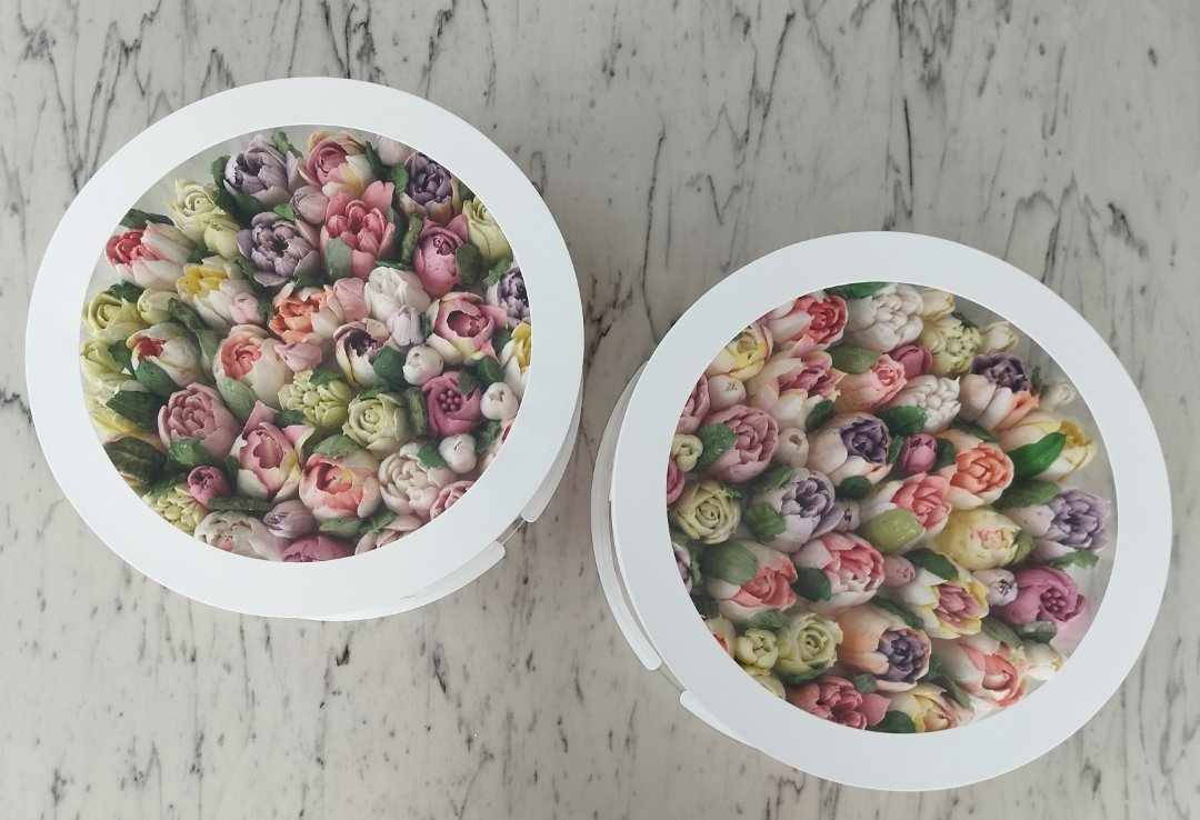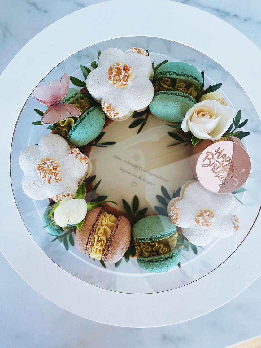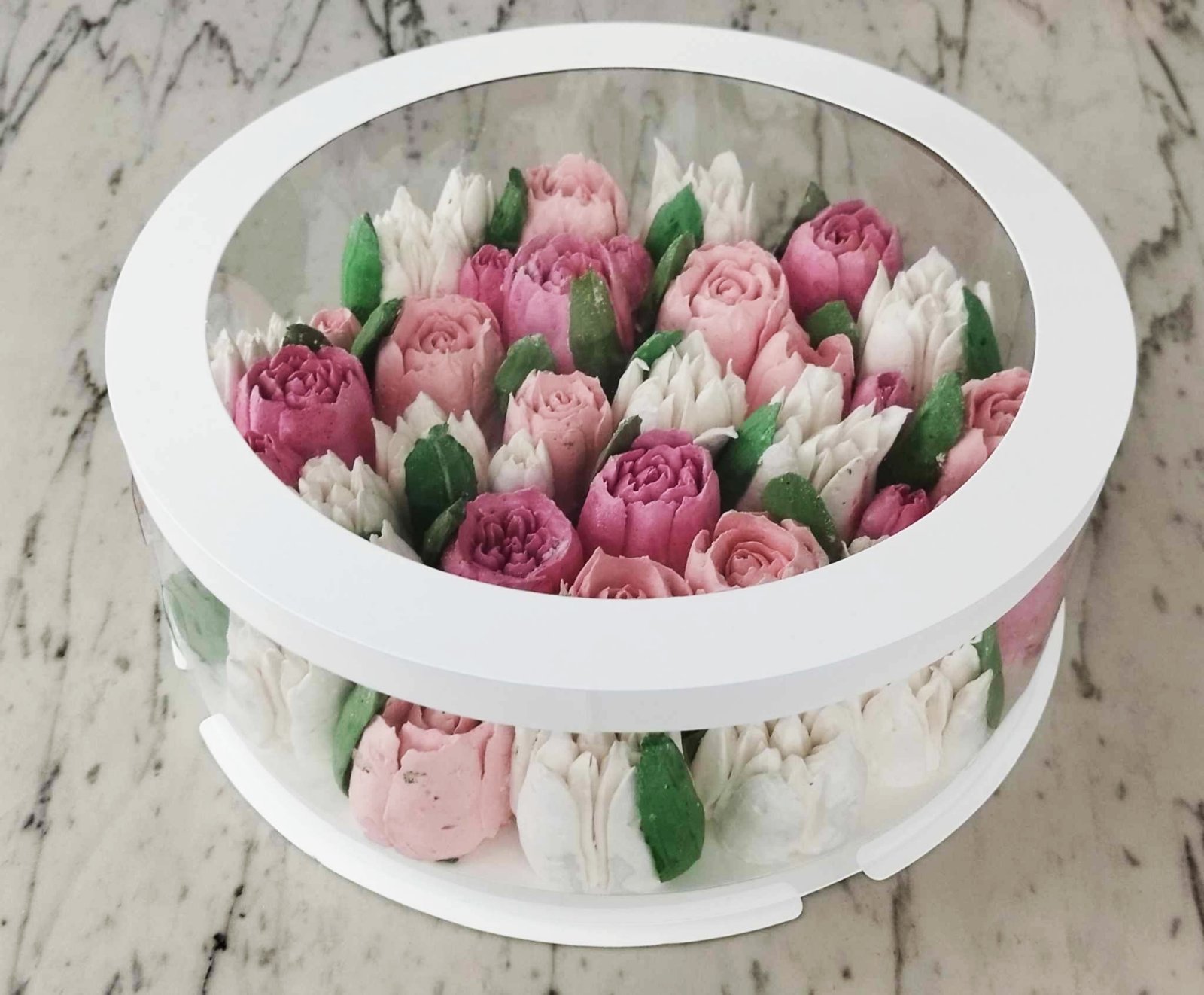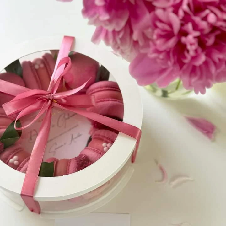 Apvali skaidri dėžutė zefyrinėms gėlėms, macarons sausainiams ar putėsiniams tortams. Elegantiškos, dailios ir puošnios - daili pakuotė Jūsų saldiems stebuklams.